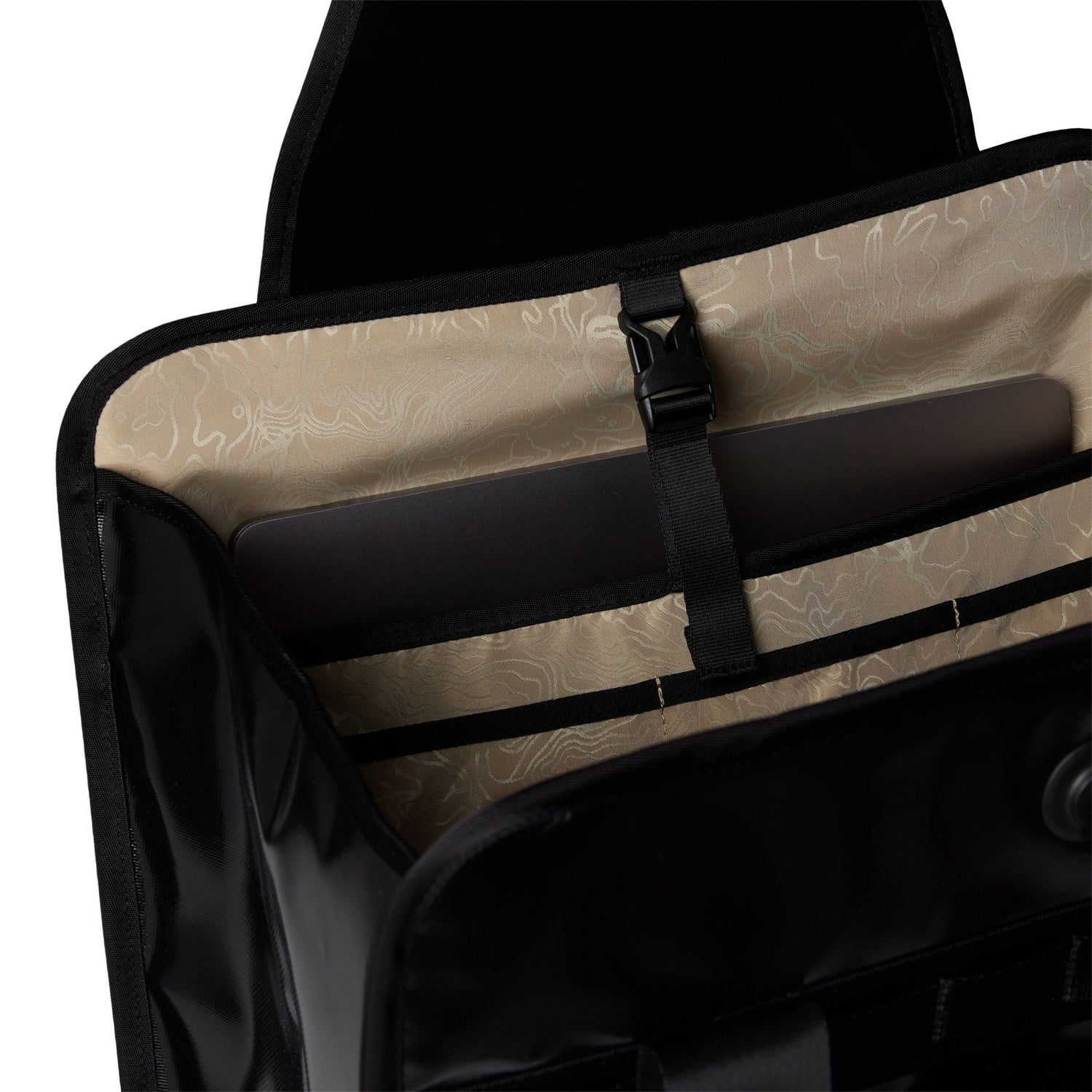 Compartiment interior bine organizat cu husă căptușită pentru laptop de 16” cu închidere cu cataramă