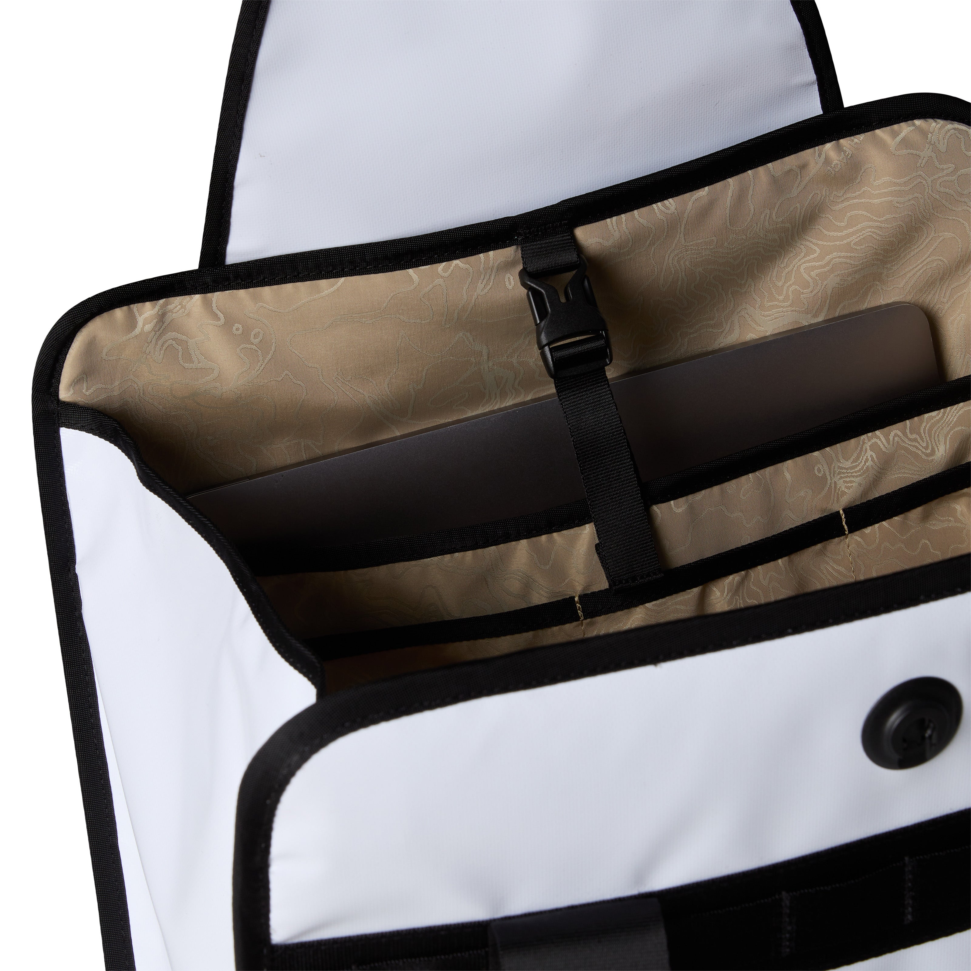 Compartiment interior bine organizat cu husă căptușită pentru laptop de 16” cu închidere cu cataramă